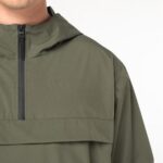 100% polyester recyclé post-consumer. Coupe droite. Tissu contrecollé 2 couches avec membrane intérieure et coutures thermo-soudées permettant au produit d’être imperméable. Imperméable 4000mm. Respirant 3000 g/m²/24h. Milieu devant avec quart de zip imperméable recyclé. Poche poitrine traversante avec rabat et deux poches côtés passepoilées avec zip inversé. Deux œillets d’aération sous le rabat de la poche devant. Capuche 3 panneaux. Cordon de serrage avec stoppeurs recyclés à l’intérieur de la capuche et au bas du vêtement côté gauche au porté. Bas de manches élastiqués. Ourlet simple surpiqûre bas de manches et bas de vêtement.
