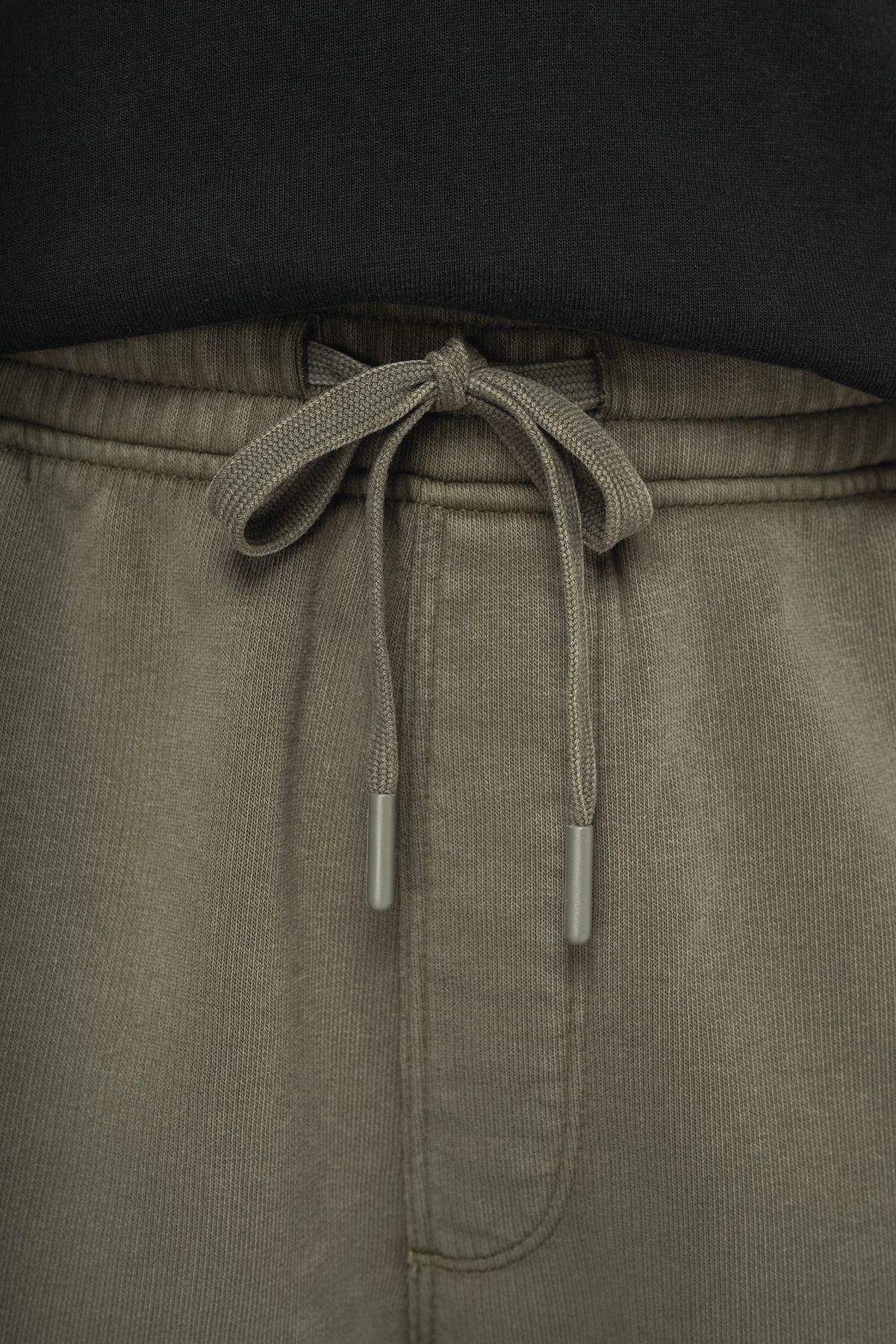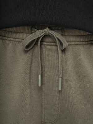 85% coton biologique / 15% polyester recyclé post-consumer. Coton peigné. Lavé aux enzymes. Molleton non gratté 3 fils LST (Low Shrinkage Terry : molleton pré-rétréci). Ceinture élastiquée. Cordon de serrage plat avec embout en plastique recyclé, mat ton sur ton. Œillets brodés. Fausse braguette. Double surpiqûre fourche devant et dos pour plus de maintien. Poches côtés et poches goussets latérales plaquées bas de vêtement avec rabats. Poches plaquées dos. Ourlet bas de jambes double surpiqûre. Vêtement teint après montage : les couleurs peuvent légèrement varier d’une pièce à l’autre. Ce produit est susceptible de déteindre au contact avec des surfaces ou vêtements clairs.