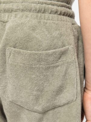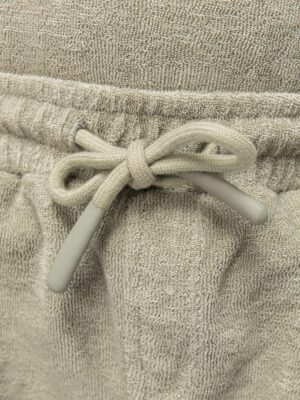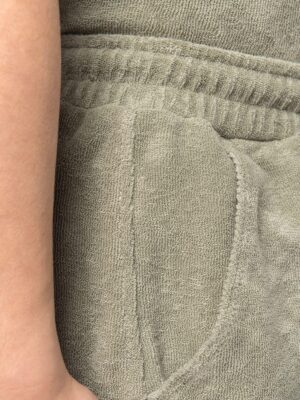 80% coton biologique / 20% polyester recyclé post-consumer. Fabriqué au Portugal. Coton peigné. Matière éponge. Lavé aux enzymes. Ceinture en matière principale avec taille élastiquée. Cordon de serrage à la taille avec embout en silicone ton sur ton. Fausse braguette fantaisie. Deux poches latérales à l’avant avec double surpiqûre à l’ouverture de poche. Poche plaquée dos, côté droit au porté. Ourlet double surpiqûre bas de vêtement.