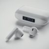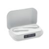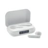 Ecouteurs sans fil (TWS) 5.3 en ABS avec micro et batterie intégrée de 25 mAh. Indicateur de charge LCD. Durée de lecture env 3h. Appairage automatique. Câble de type C et une station de charge de 250 mAh.