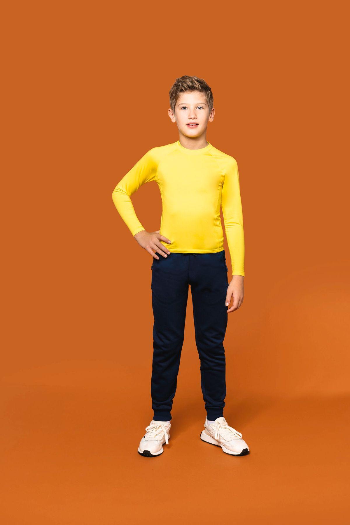 88% polyester / 12% élasthanne. Encolure ronde. Points de recouvrement ton sur ton. Finition double aiguille bas de manche et de vêtement.