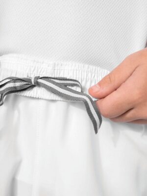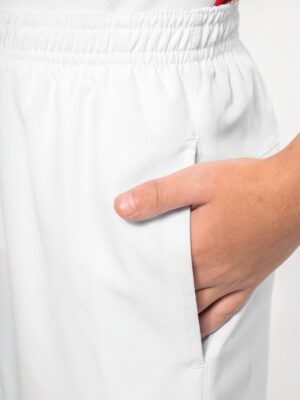 94% polyester / 6% élasthanne. Matière très souple et confortable. 2 poches profondes devant. Taille élastiquée avec cordon de serrage.
