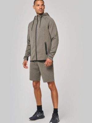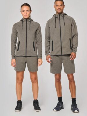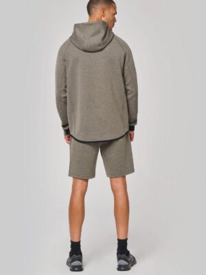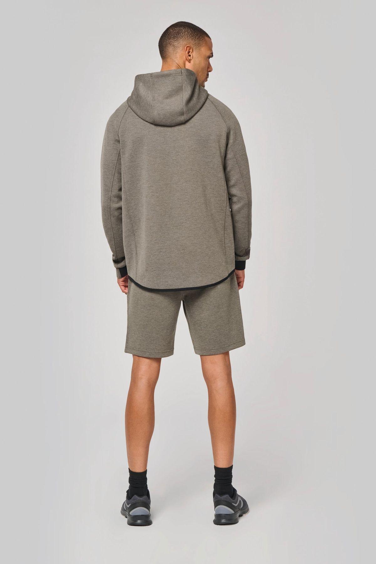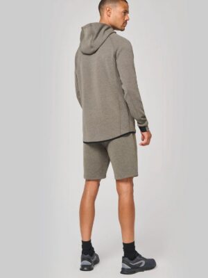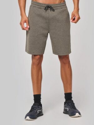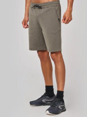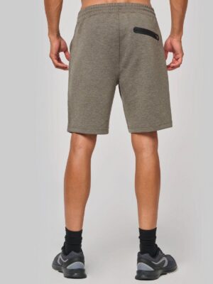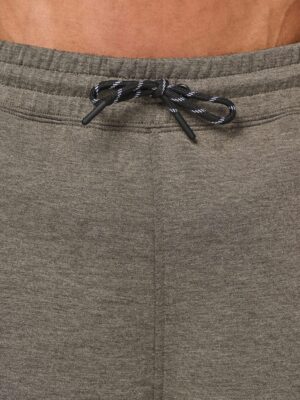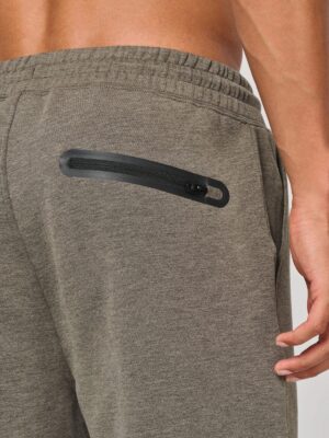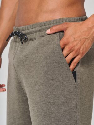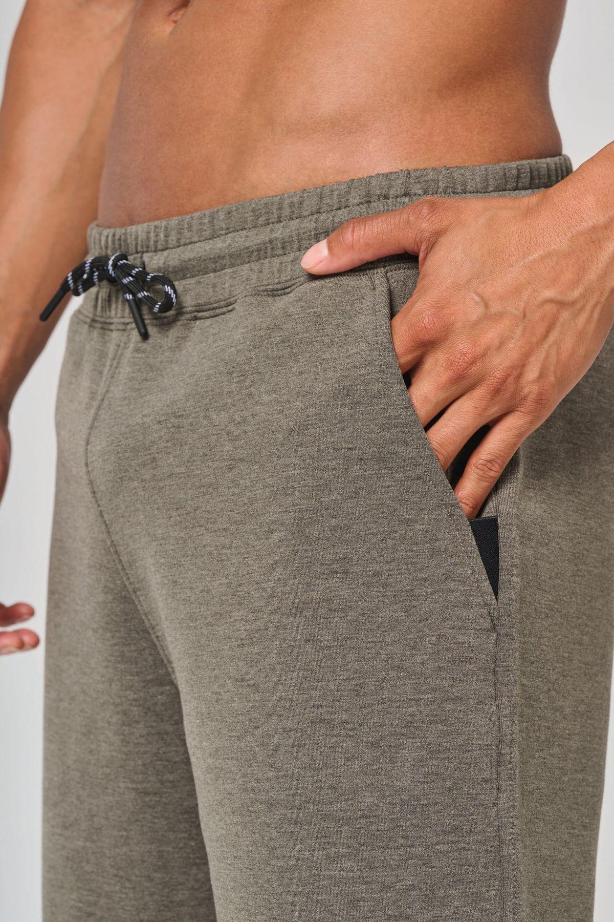 Coloris unis : 94% polyester / 6% élasthanne. Coloris chinés : 79% polyester / 15% viscose / 6% élasthanne. Matière ultra confortable. Ceinture élastiquée avec cordon de serrage bicolore finition embout plastique et œillets métalliques. 2 poches devant doublées jersey et 1 poche arrière zippée, finition thermosoudée contrastée. Finition poches avec une partie élastiquée contrastée Black sur tous les coloris et Dark Grey sur le Black et le Ash Heather. Finition double aiguille sur bas de vêtement. Etiquette de marque Tear-away.