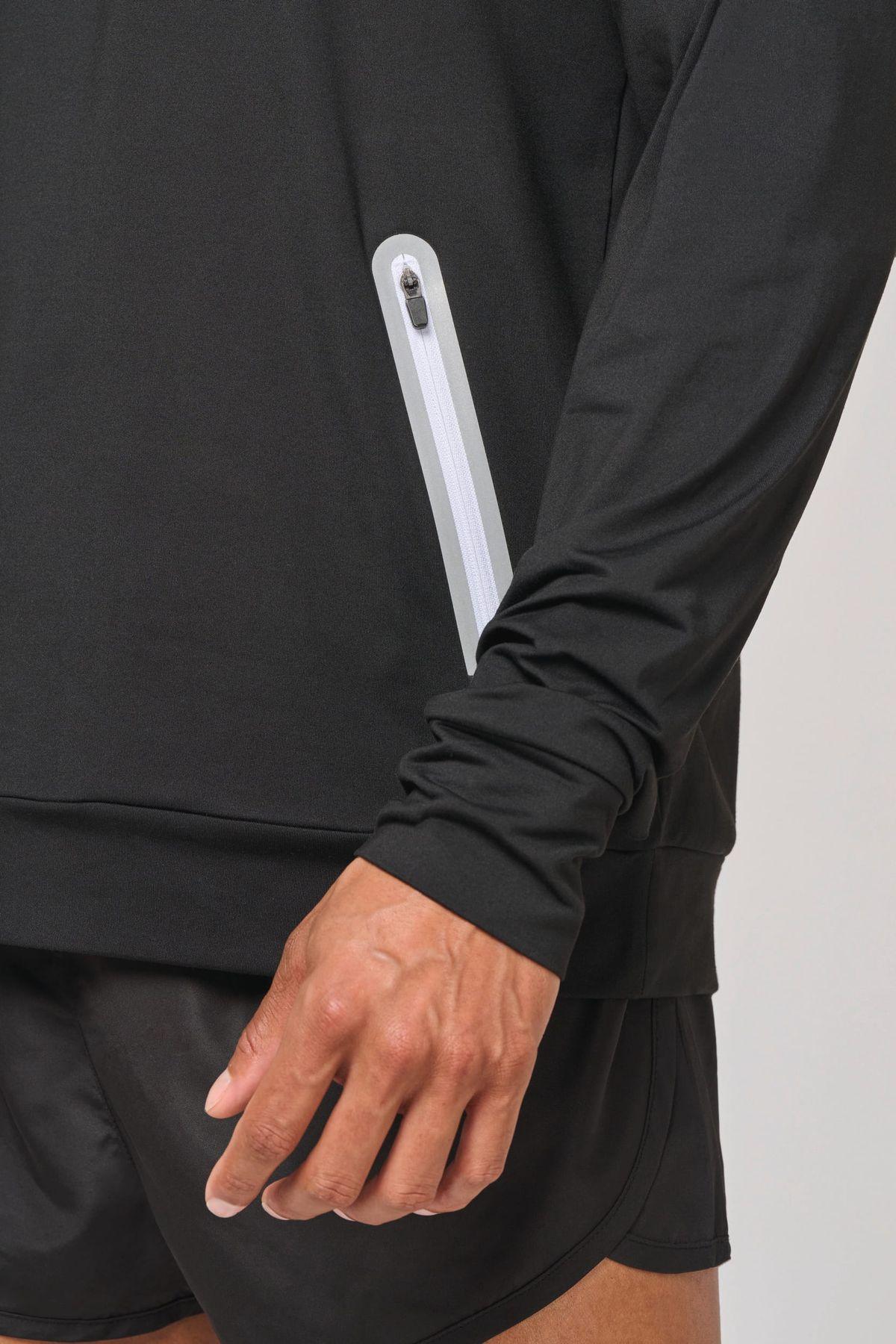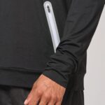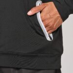 90% polyester / 10% élasthanne. Tissu jersey gratté ultra doux. Manches raglan. 2 poches zippées et réfléchissantes. Zips et cordons : White pour le coloris Navy, Black pour le coloris Red et Sport Grey Mélange et Lime pour le coloris Dark Grey.