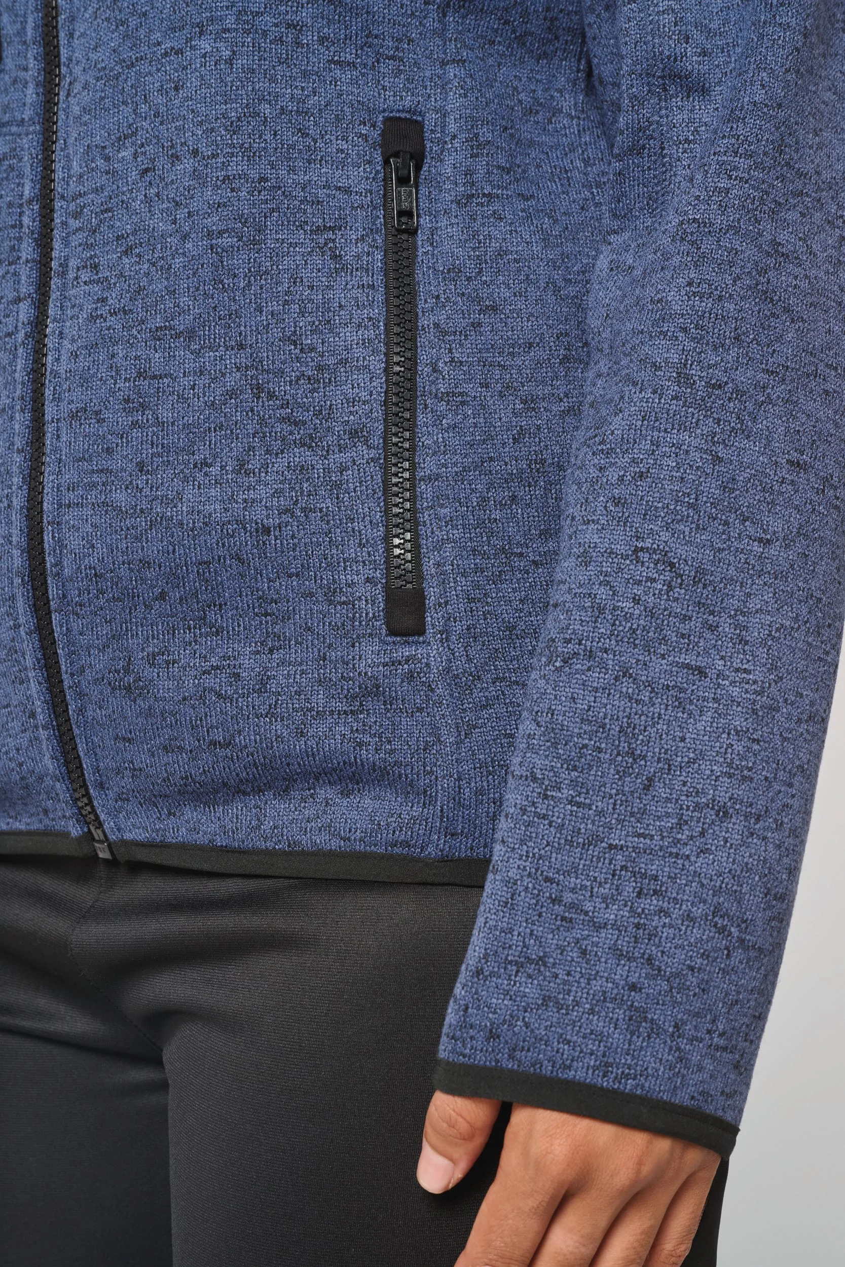 Tricot intérieur gratté 100% polyester. 2 poches devant zippées contrastées et 1 poche poitrine zippée contrastée. Capuche doublure contrastée jersey 100% coton avec cordon de serrage plat contrasté. Bas de manches et de vêtement avec finition biais contrasté élastiqué. Point de recouvrement sur les découpes.