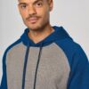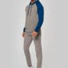 65% polyester / 35% coton. Molleton gratté. Manches raglan et capuche contrastées. Capuche doublée en maille filet ton sur ton. Poches kangourou avec poche téléphone fluorescente. Passe-fil écouteurs. Poignets et bas de vêtement en bord-côte double épaisseur 2 x 2.