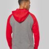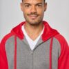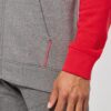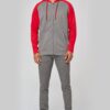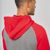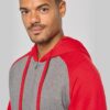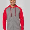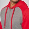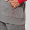 65% polyester / 35% coton. Molleton gratté. Fermeture zippée. Manches raglan et capuche contrastées. Capuche doublée en maille filet ton sur ton. Poches kangourou avec poche téléphone fluorescente. Passe-fil écouteurs. Poignets et bas de vêtement en bord-côte double épaisseur 2×2.