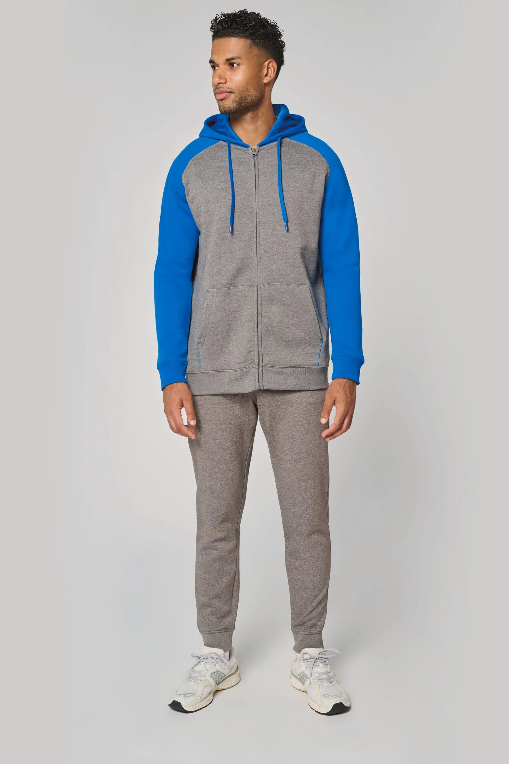 65% polyester / 35% coton. Molleton gratté. Fermeture zippée. Manches raglan et capuche contrastées. Capuche doublée en maille filet ton sur ton. Poches kangourou avec poche téléphone fluorescente. Passe-fil écouteurs. Poignets et bas de vêtement en bord-côte double épaisseur 2×2.