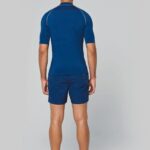 88% polyester / 12% élasthanne. Maille extensible. Protection UV 40+ conforme aux exigences de la norme EN13758-1&2. Manches courtes. Col montant. Coupe très près du corps. Boucle élastique insérée dans l’ourlet devant permettant de passer le cordon du short afin de stabiliser le t-shirt. Surpiqûres contrastées. Finition double aiguilles aux manches et bas de vêtement.