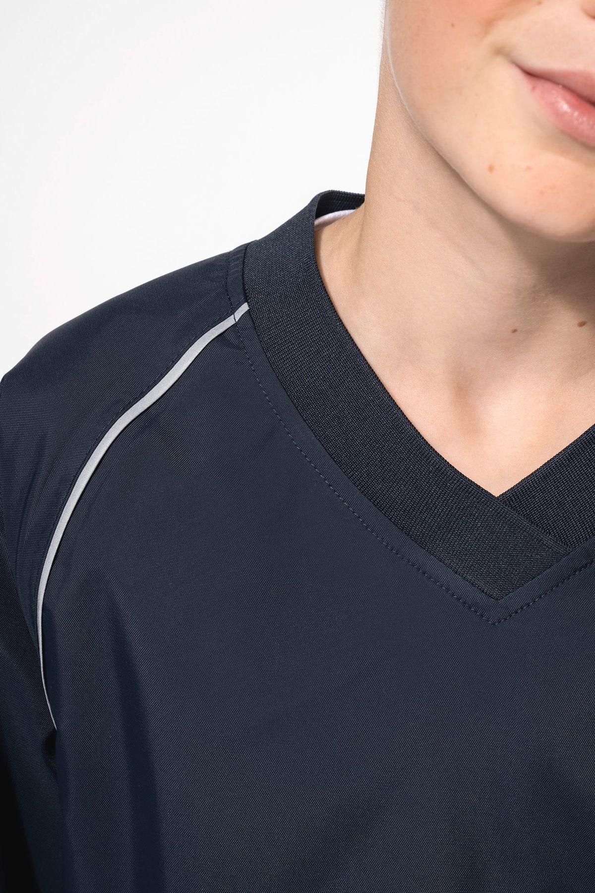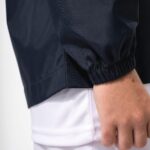 100% polyamide Oxford. Enduction PU. Tissu imperméable 1500 mm. Coutures thermosoudées aux emmanchures. Manches raglan. Encolure en V en bord-côte 1×1. Œillets d’aération dessous de bras. Passepoil contrasté aux emmanchures. Bas de manches élastiqués. Finition ourlet en bas du vêtement. Etiquette de marque détachable.