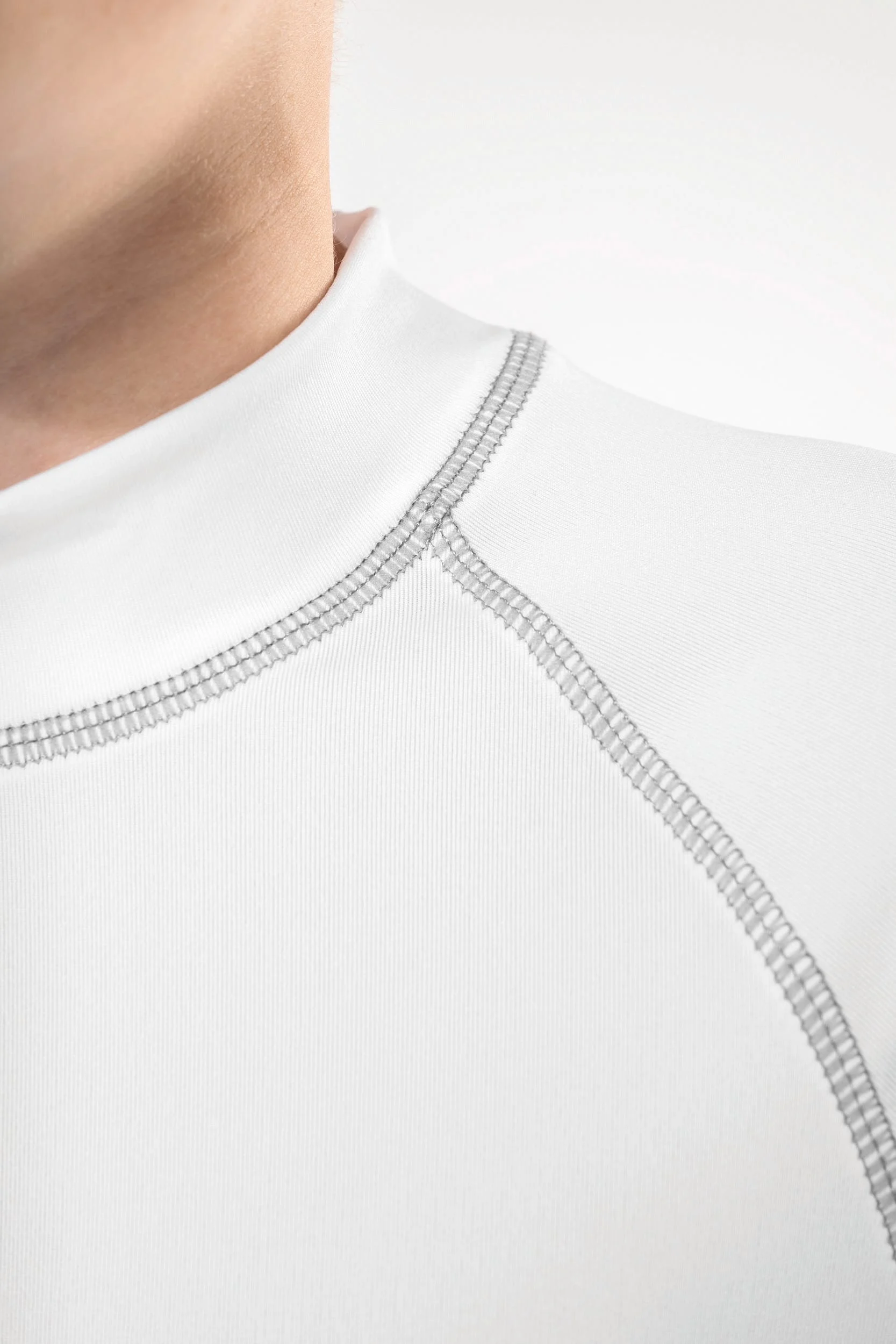 88% polyester recyclé / 12% élasthanne. Maille extensible. Coupe skinny. Protection UV50+ correspondant à la norme EN13758-1&2. Manches longues raglan avec surpiqûres contrastées. Col montant. Boucle élastique insérée dans l’ourlet devant permettant de passer le cordon du short afin de stabiliser le t-shirt. Finition double aiguilles aux manches et bas de vêtement. Etiquette de marque déchirable pour faciliter la personnalisation.