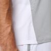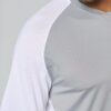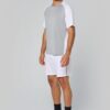 90% polyester / 10% élasthanne. Partie birdseye : 92% polyester / 8% élasthanne. Panneaux contrastés en maille “birdseye”. Coupe ajustée. Manches raglan. Encolure ronde maille jersey avec montage d’un insert ton sur ton devant col. Bande de propreté jersey ton sur ton. Panneaux contrastés (ou unis pour le coloris Black) en maille birdseye sur les côtés, manches et dos. Finition double aiguille bas de manches et de vêtement. Etiquette de marque Tear-away.