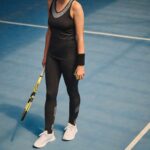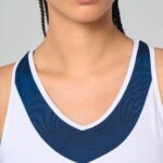 80% polyester / 20% élasthanne. Inserts contrastés : 90% polyester / 10% élasthanne. Tissu maille jersey. Coupe moulante. Encolure profonde. Finition biais sur encolure et emmanchures et double aiguille bas de vêtement. Etiquette de marque Tear-away.