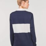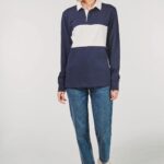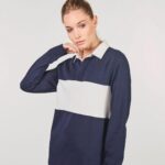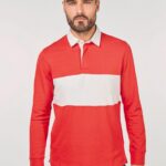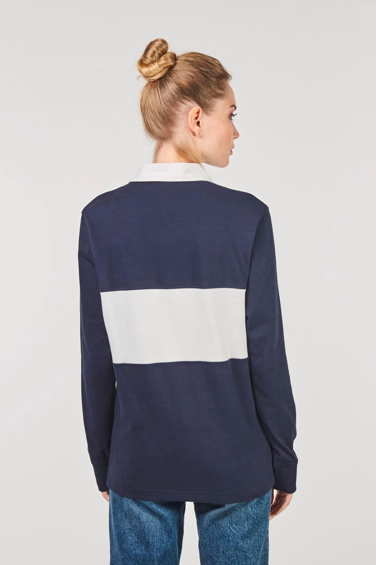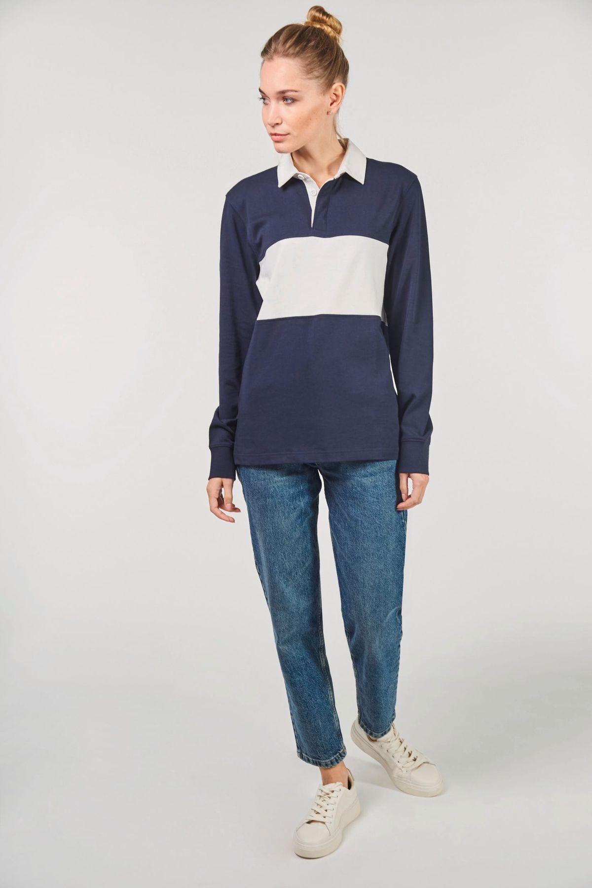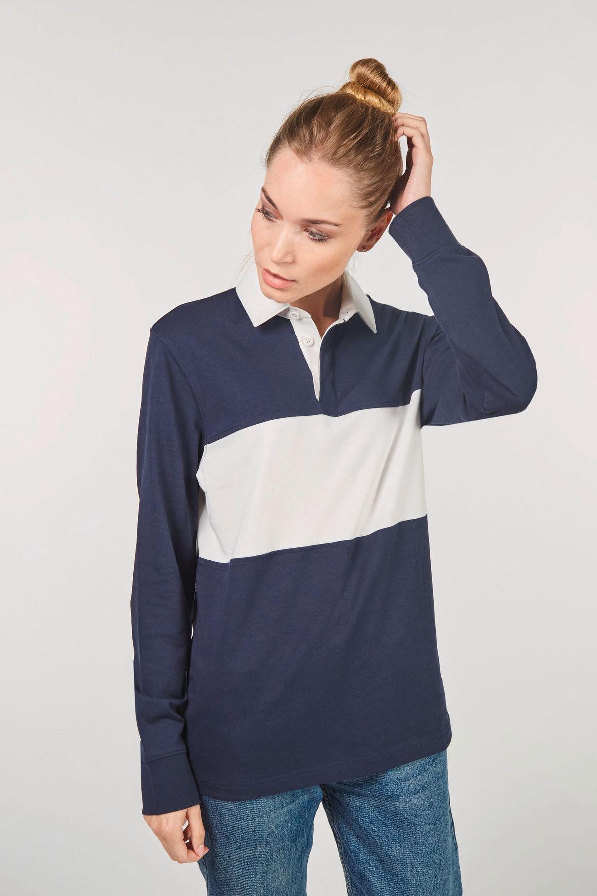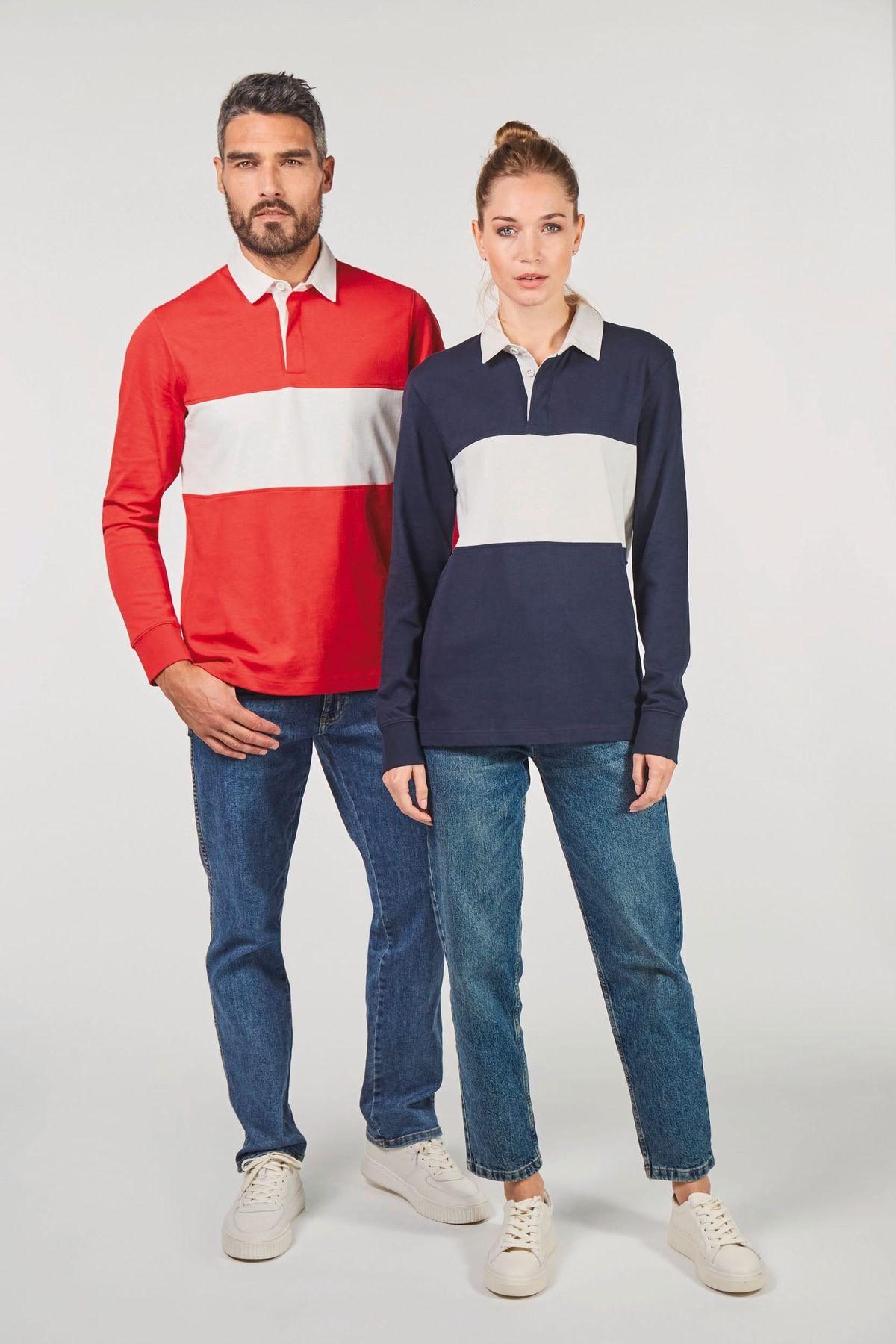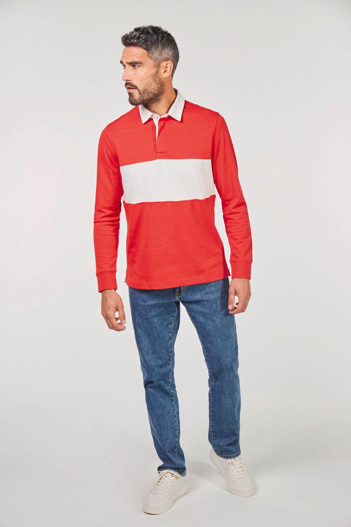 100% coton. Tissu jersey. Coupe droite. Col et patte intérieure en coton sergé blanc. Patte 3 boutons en caoutchouc. Poignets en bord-côtes 1 x 1. Bande de propreté col en chevron ton sur ton. Bande centrale devant et dos en couleur contrastée. Bas de vêtement avec fentes latérales et bande chevron ton sur ton. Surpiqûre double aiguille aux emmanchures et aux poignets. Finitions double aiguille bas de vêtement. Etiquette de marque détachable.