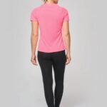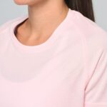 100% polyester. Tissu léger à séchage rapide. Encolure ronde avec bande de propreté. Manches raglan avec points de recouvrement. Finition double aiguille à l’encolure, bas de manches et de vêtement.