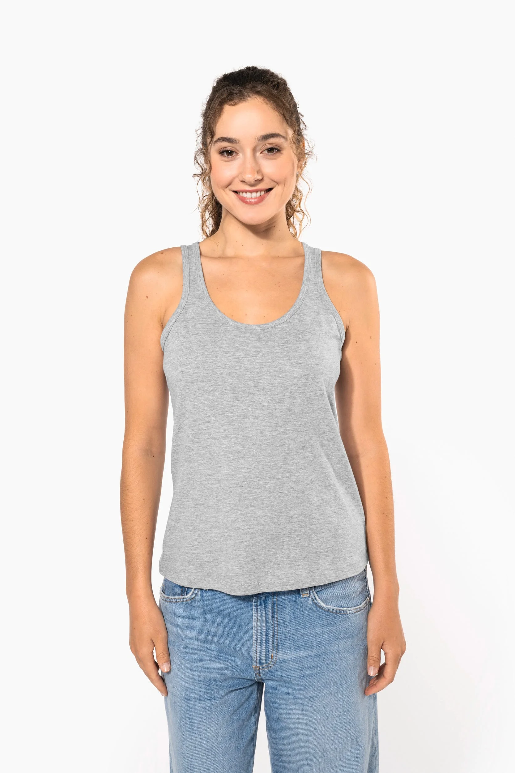 100% polyester. Tissu léger à séchage rapide. Biais à l’encolure et aux emmanchures. Finition double aiguille au bas du vêtement.