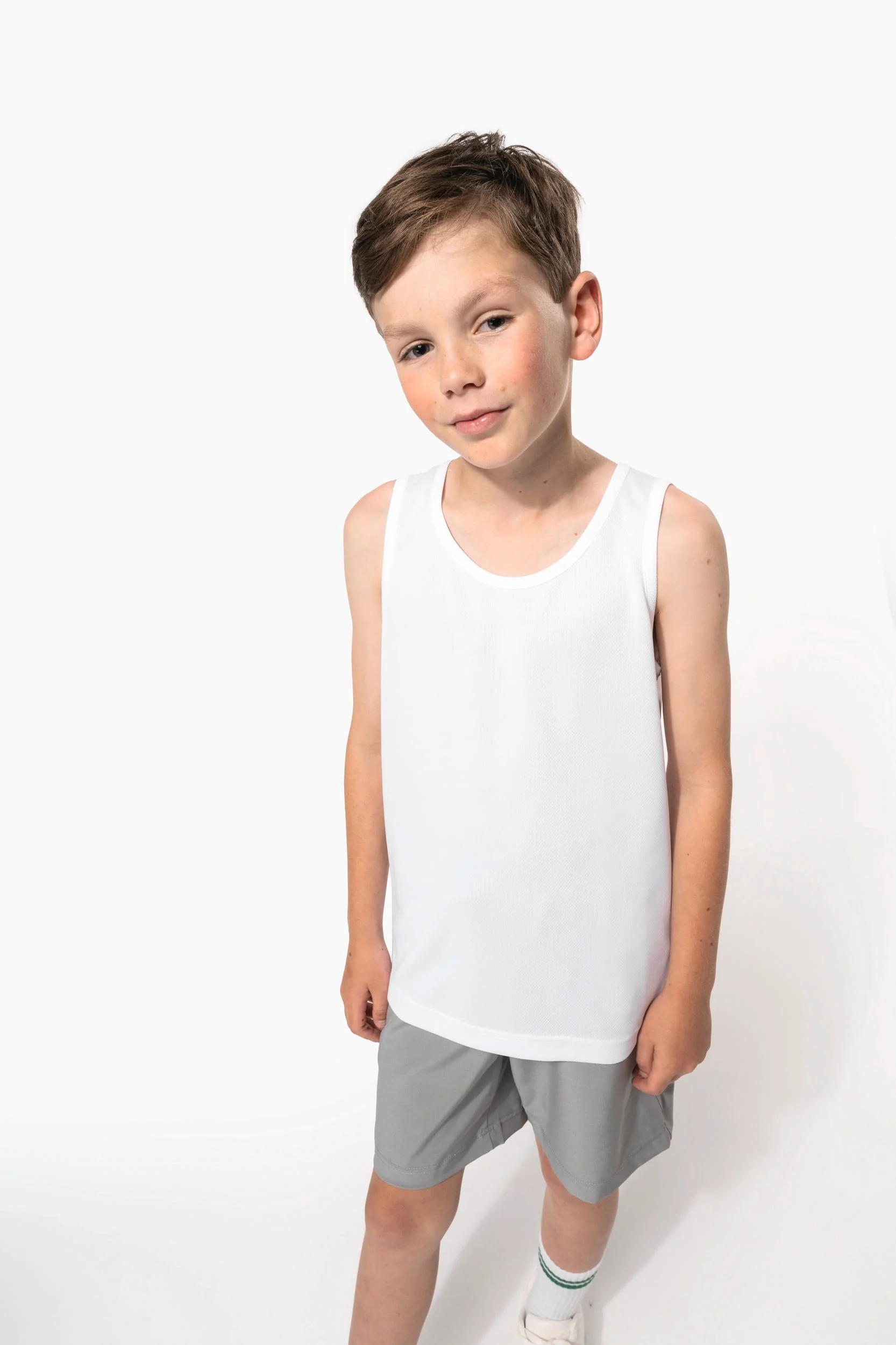 100% polyester. Tissu léger à séchage rapide. Dos nageur. Biais à l’encolure et aux emmanchures. Finition double aiguille au bas du vêtement.