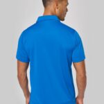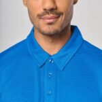 100% polyester. Maille interlock contenant 50% de (polyester) Cool Plus ®. Polo respirant. Patte 3 boutons. Finition double aiguille au bas du vêtement et manches.