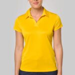 100% polyester. Maille interlock contenant 50% de (polyester) Cool Plus ®. Polo respirant. Patte sans bouton. Finition double aiguille au bas du vêtement et manches.