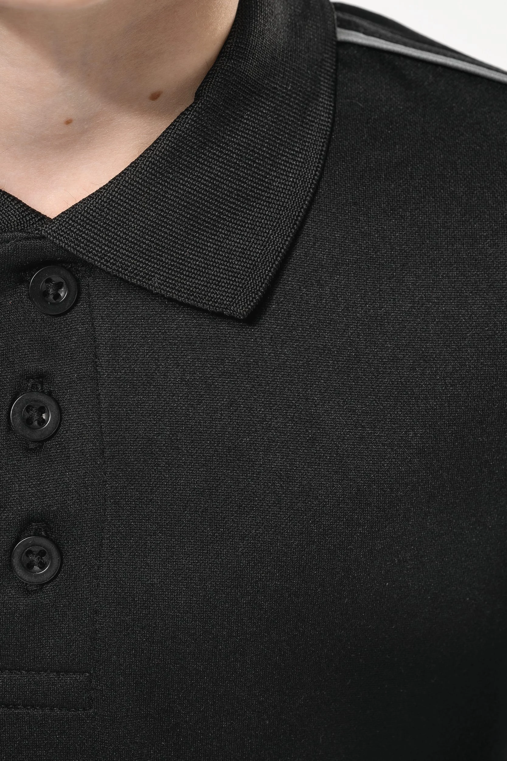 100% polyester interlock. Tissu à séchage rapide. Col en bord-côte. Patte de boutonnage 3 boutons. Bande de propreté contrastée au col et sur fentes latérales. Passepoil contrasté aux épaules. Finition double aiguille bas de manches et de vêtement.