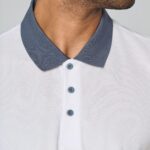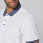 100% polyester. Maille piquée Cool Plus®. Coupe ajustée et look moderne. Col et bas de manche en bord-côte contrasté. Patte de boutonnage 3 boutons (contrastés ou unis selon modèle). Fentes latérales.