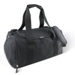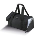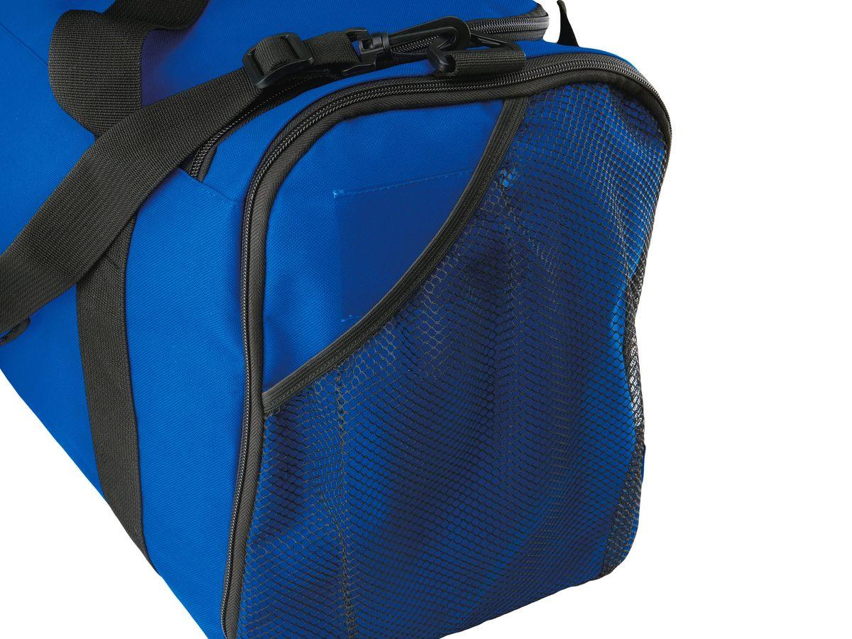 Sac de sport/ sports collectifs grande taille : 61 cm en polyester 600D, 2 poches côté : 1 pour rangement chaussures, 1 poche côté extérieure en filet. Lanière d’épaule amovible et ajustable. 54 litres.