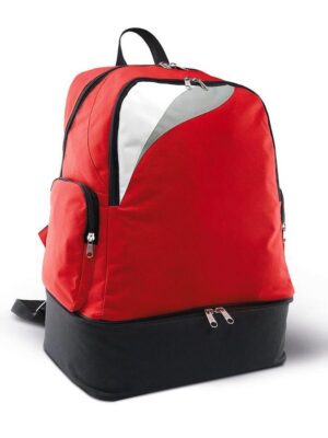 Sac à dos multisports / sports collectifs en polyester 600D, fond rigide pour compartiment chaussures, grande poche zippée devant, 2 poches de chaque côté zippées. 39 litres.