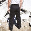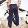 65% polyester / 35% coton. Pantalon coupe-vent. Taille extensible, avec fermeture par bouton et braguette zippée. Coutures articulées aux genoux. Coutures double piqûre renforcées sur les zones sollicitées. Multi poches : larges poches latérales avec finitions réfléchissantes, poche cargo avec fermeture Velcro®, poche pour téléphone portable, poches arrières avec fermeture Velcro®, poche pour mètre, 2 poches latérales profondes, passant porte marteau.