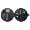 Set d’outillages 25 pièces en forme de Roue. 1 extenseur, 1 fiche de tournevis, 1 pince plate, 5 douilles, 3 clĂ©s, 10 embouts, 2 tournevis de prĂ©cision et un ruban.