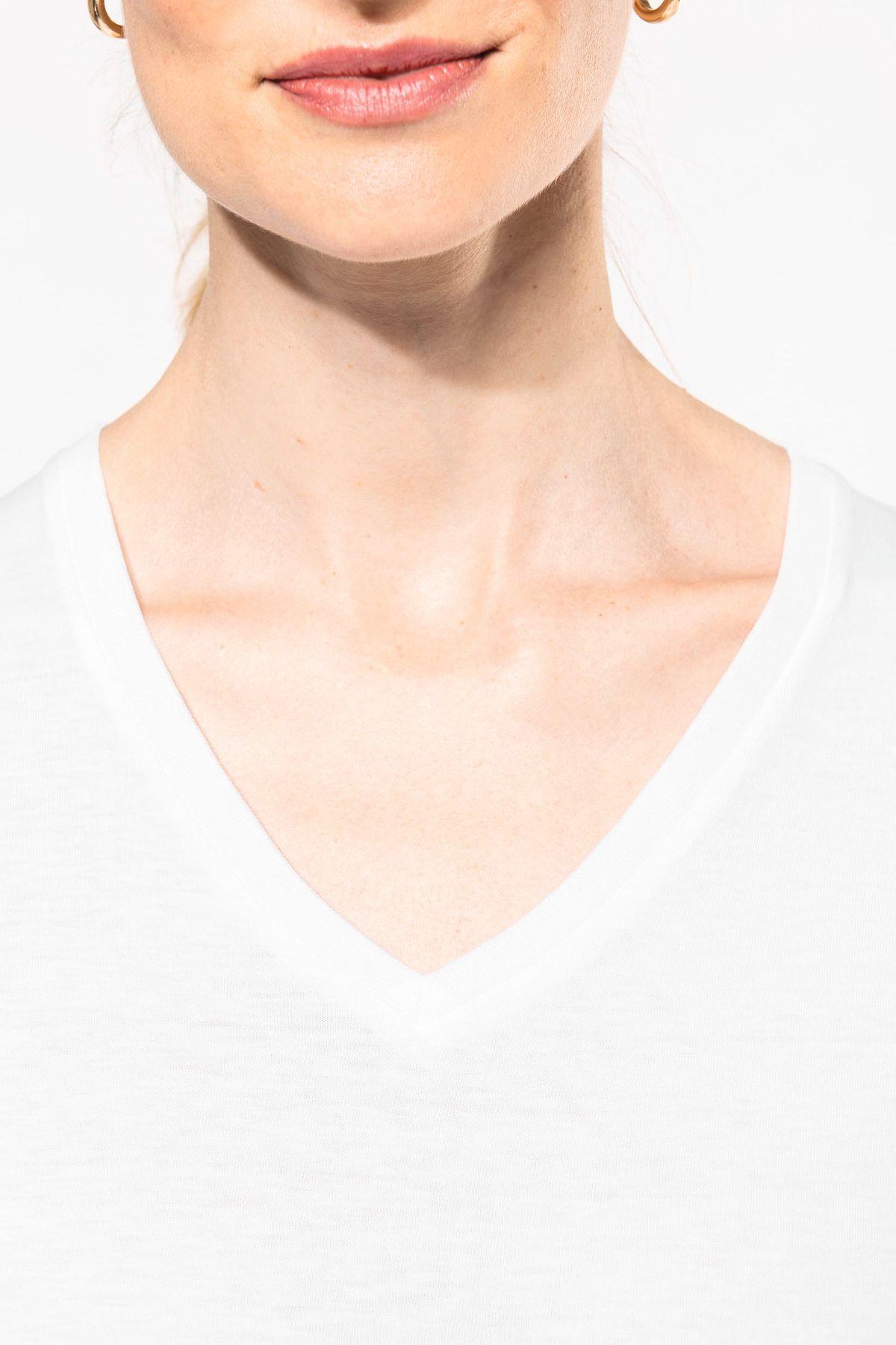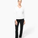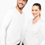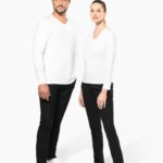 100% coton. Maille en coton peigné Supima®. Tissu jersey d’une grande finesse et de qualité supérieure. Toucher doux et soyeux. Construction coupée cousue. Encolure col V avec bande de propreté ton sur ton. Renfort de la couture épaule avec une bande siliconée. Finition bas de manches et bas de vêtement avec ourlet double surpiqûre. Pas d’étiquette de marque au col, uniquement une puce de taille pour faciliter la personnalisation.