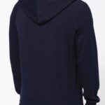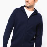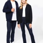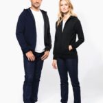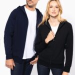 70% coton / 26% polyester / 4% élasthanne. Coton peigné. Tissu interlock. Traitement LSI (Low Shrinkage Interlock). Capuche 2 panneaux, doublée dans le même tissu que le reste de la veste, pas de cordon. Surpiqûres au col. Bande de propreté sur l’encolure intérieure. Zip nylon ton sur ton avec zipper métal et finition bande de propreté à l’intérieur. Manches raglan. Rib 1×1. 2 poches prisent dans la couture de l’empiècement. Pas d’étiquette de marque, uniquement une puce de taille pour faciliter la personnalisation.