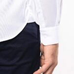 100% coton. Coton peigné. Tissu Oxford pinpoint. Entretien facile (traitement Easy care). Fil double retors 80×2 de qualité supérieure. Col Italien avec baleines amovibles. Boutons en nacre. Empiècement haut du dos. 2 pinces dans le dos. Coupe ajustée. Poignets à 2 boutons à angles arrondis. Hirondelles sur les côtés. Pas d’étiquette de marque, uniquement une étiquette de taille pour faciliter la personnalisation.
