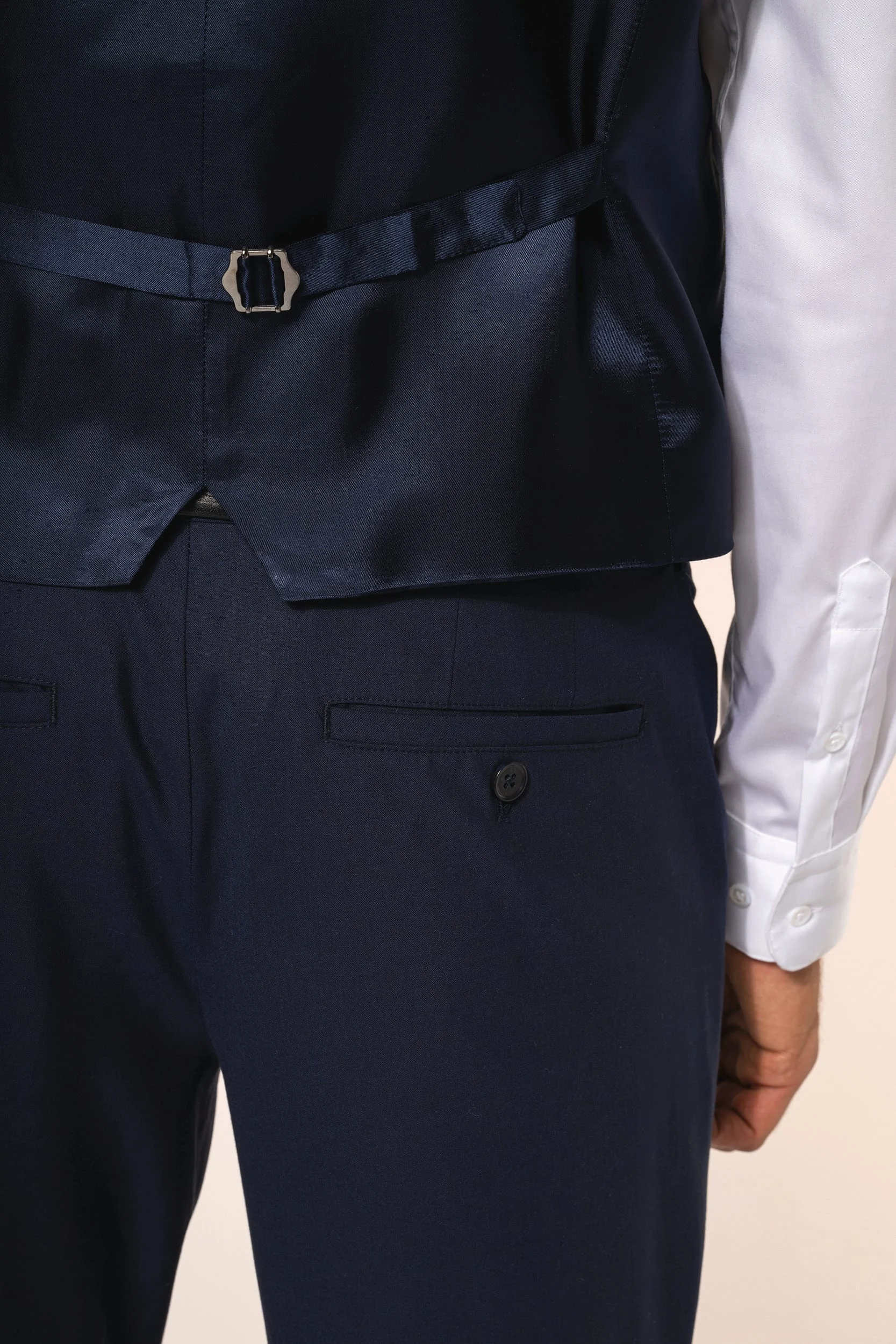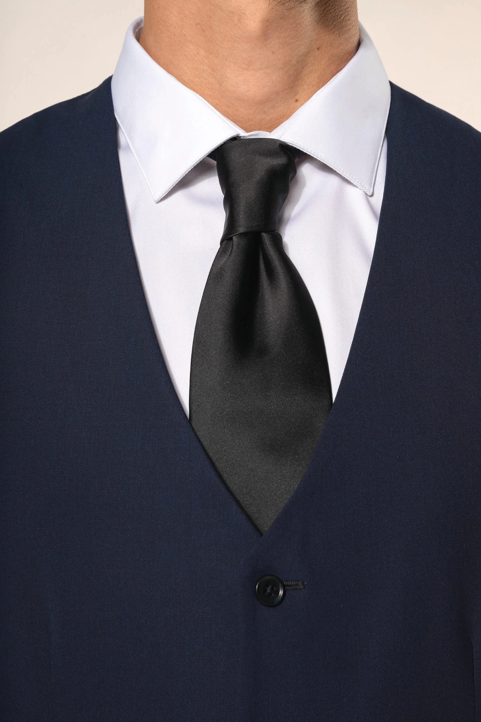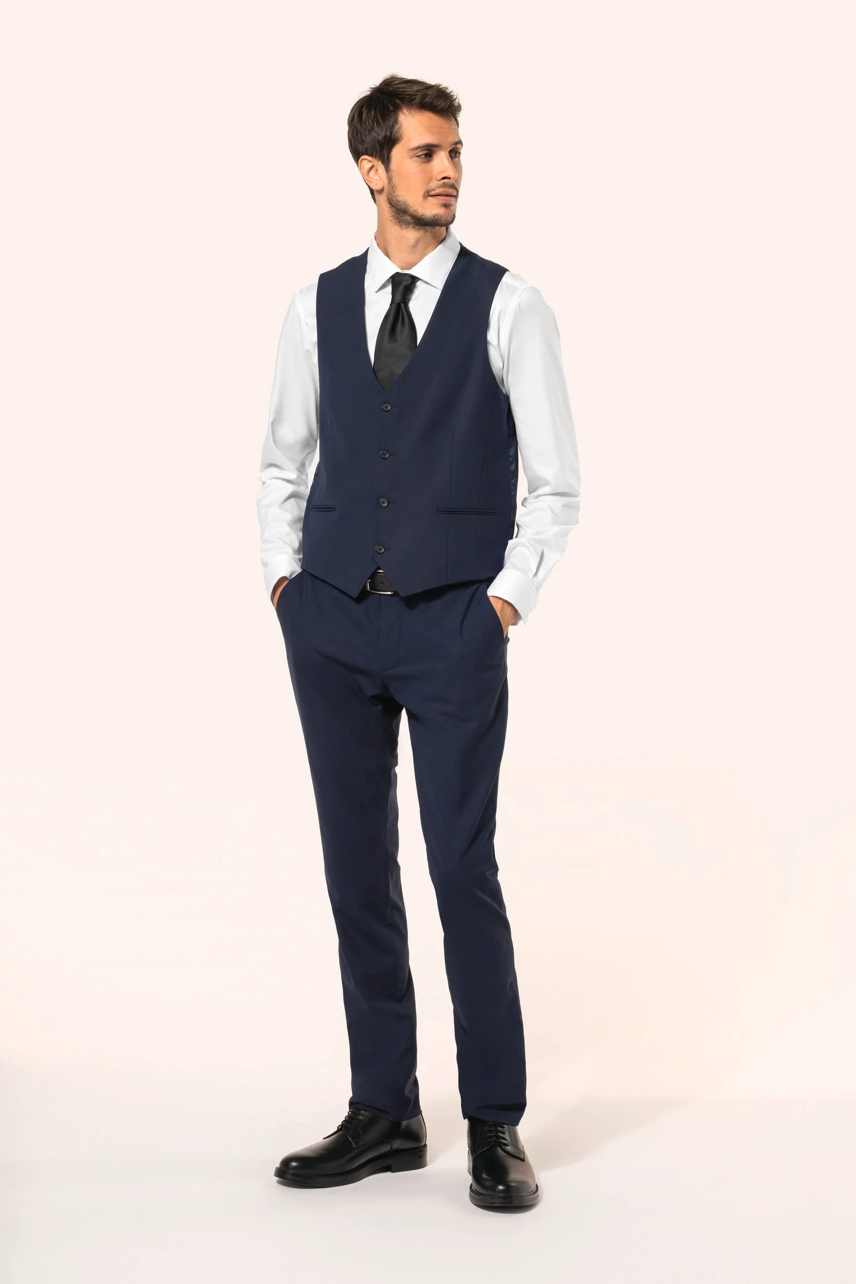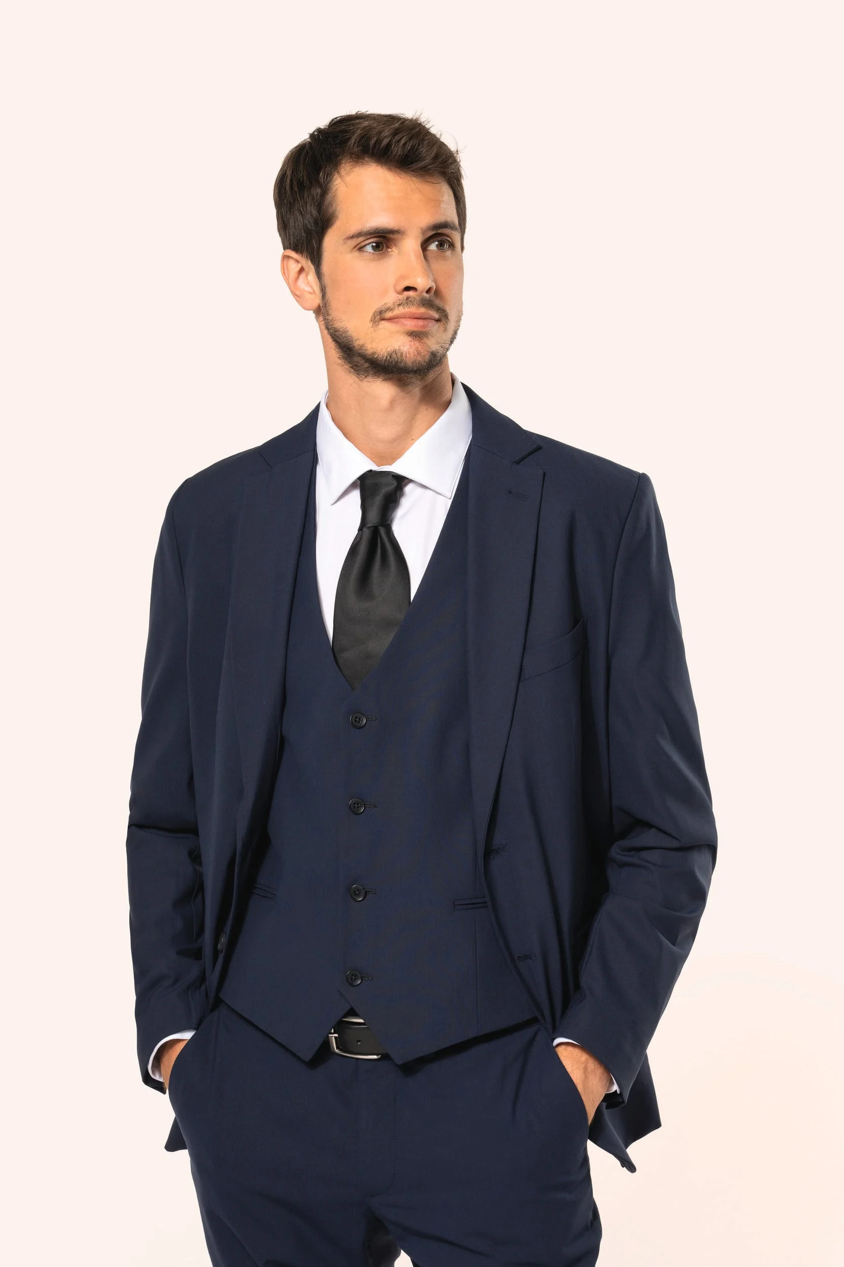 50% polyester / 23% viscose / 22% laine / 5% élasthanne. Autre matière en twill (100% polyester) ton sur ton sur extérieur dos et intérieur de vêtement. Coupe droite. Gilet fermée à quatre boutons ton sur ton et un bouton supplémentaire à partir de la taille 58. Deux poches passepoilées devant. Patte ajustable au dos avec boucle métal. Couture milieu dos avec finition en fente en V en bas de vêtement. Pas d’étiquette de marque, uniquement une puce de taille pour faciliter la personnalisation.
