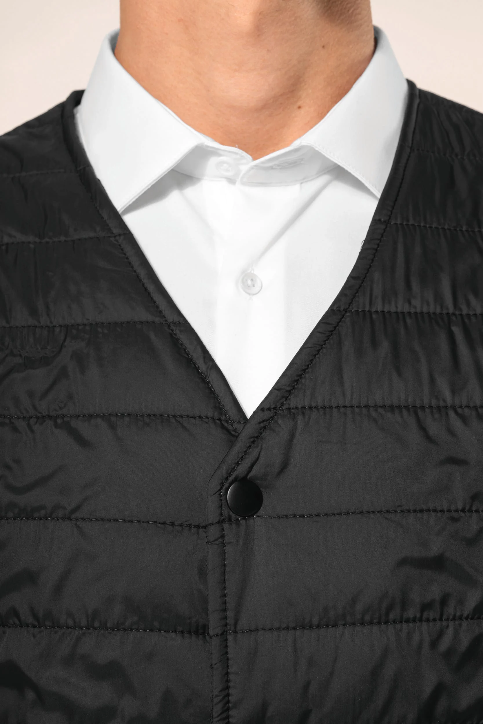 100% polyamide. Rembourrage intérieur en Thinsulate™. 2 poches côtés. Fermeture boutons pressions ton sur ton. Zip de personnalisation côté gauche. Très fin afin de pouvoir le porter sous une veste. Pas d’étiquette de marque, uniquement une puce de taille pour faciliter la personnalisation.