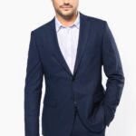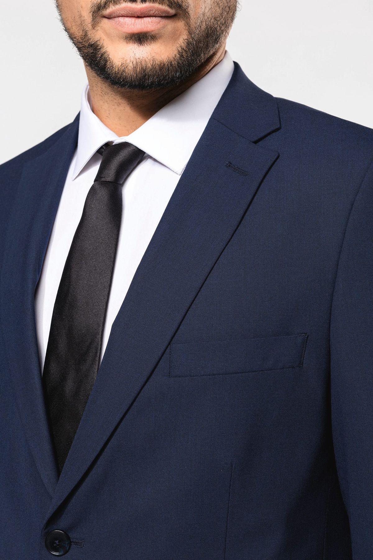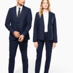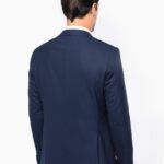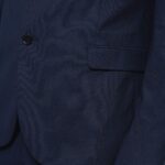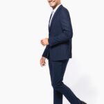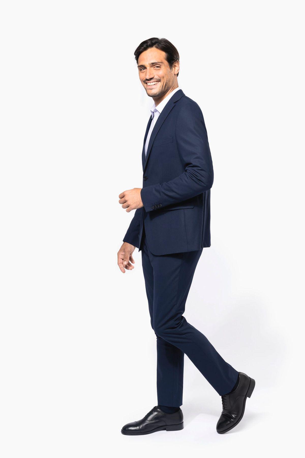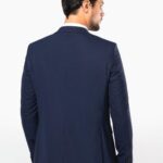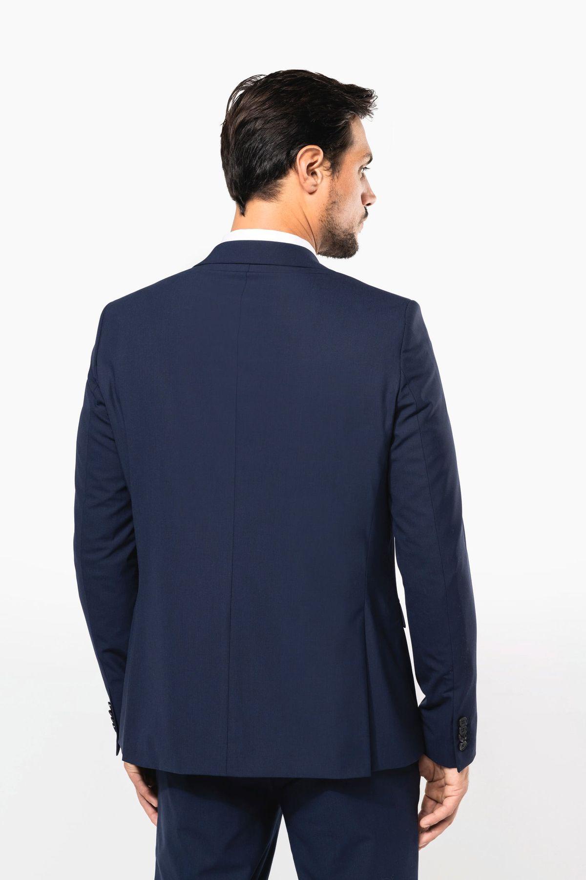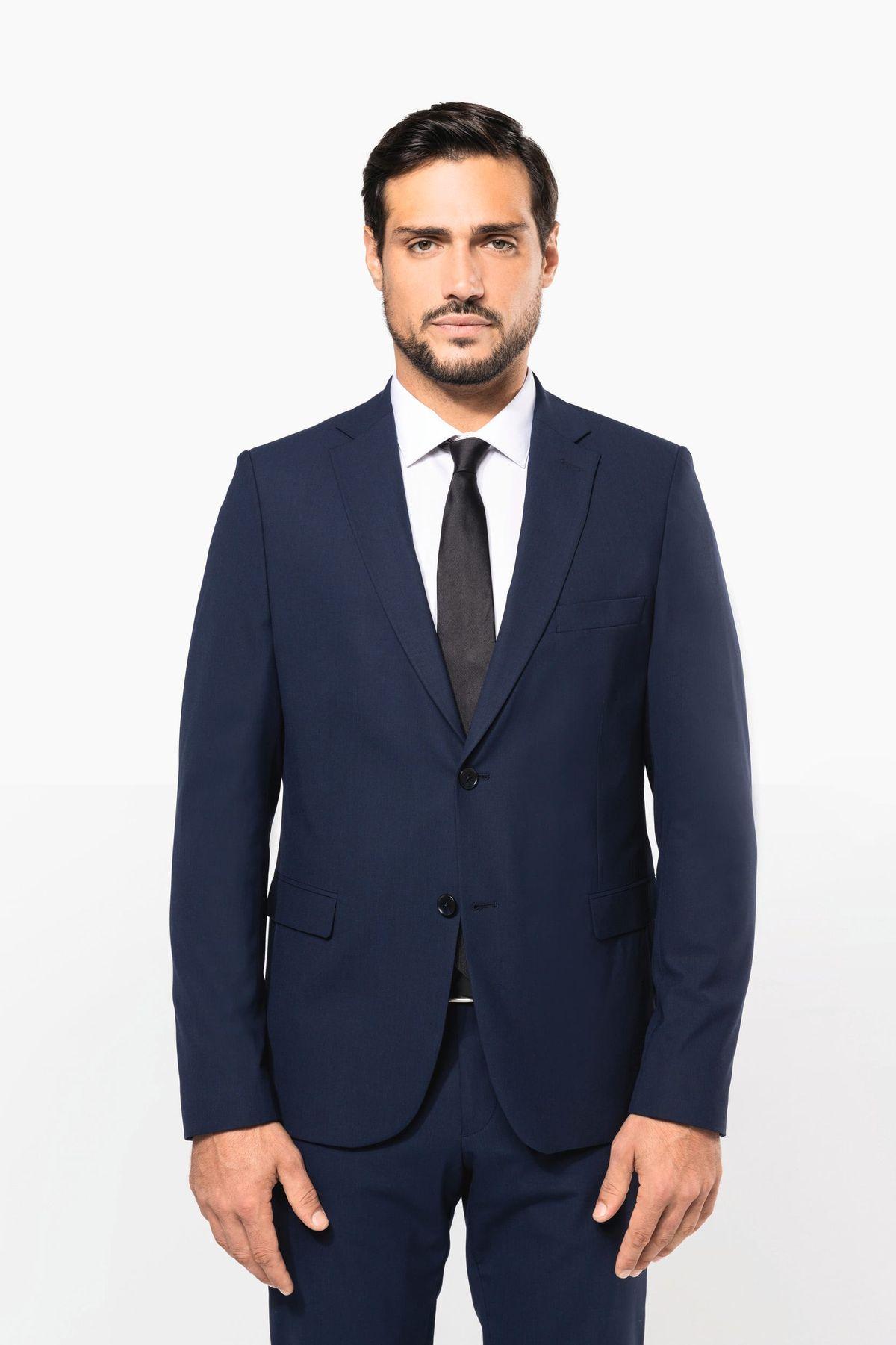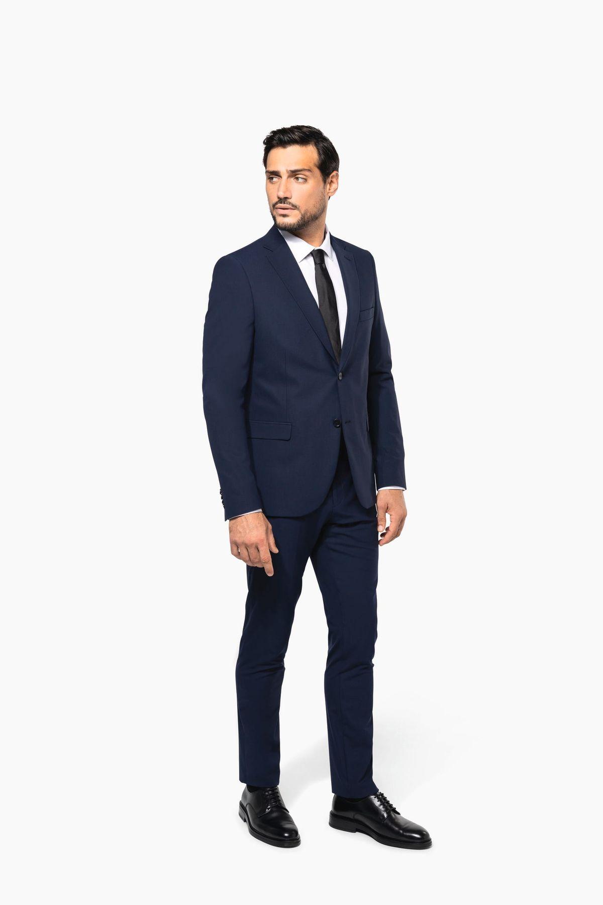 50% polyester / 23% viscose / 22% laine / 5% élasthanne. Doublure en twill (100% polyester) ton sur ton ton. Coupe ajustée. Veste à deux boutons ton sur ton. Deux poches passepoilées avec rabats, ainsi qu’une poche poitrine passepoilée côté cœur. Fausse boutonnière ton sur ton sur revers de col. Empiècement côté qui vient donner la forme au produit. Bride de suspension en satin à l’encolure. Couture milieu dos avec deux fentes bas de vêtement. Bas de manches avec fausse fente à 4 boutons ton sur ton. Finition avec un biais contrasté, pour les deux poches poitrines intérieures. Une poche téléphone et une poche ticket passepoilées ton sur ton intérieur gauche du vêtement au porté. Zip de personnalisation côté gauche au porté. Pas d’étiquette de marque, uniquement une puce de taille pour faciliter la personnalisation.
