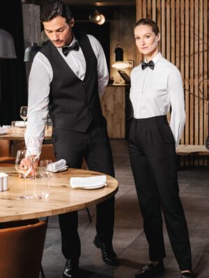 55% viscose / 42% polyester / 3% élasthanne. Tissu twill. Deux poches italiennes devant. Deux fausses poches passepoilées au dos. Braguette avec zip en nylon, deux crochets en métal et un bouton sous patte. Deux plis d’aisance devant avec un pli permanent jambe. Ceinture dos élastiquée pour plus de confort. Finition ceinture intérieure en matière principale avec une bordure en biais ton sur ton. Pas d’étiquette de marque, uniquement une puce de taille pour faciliter la personnalisation.