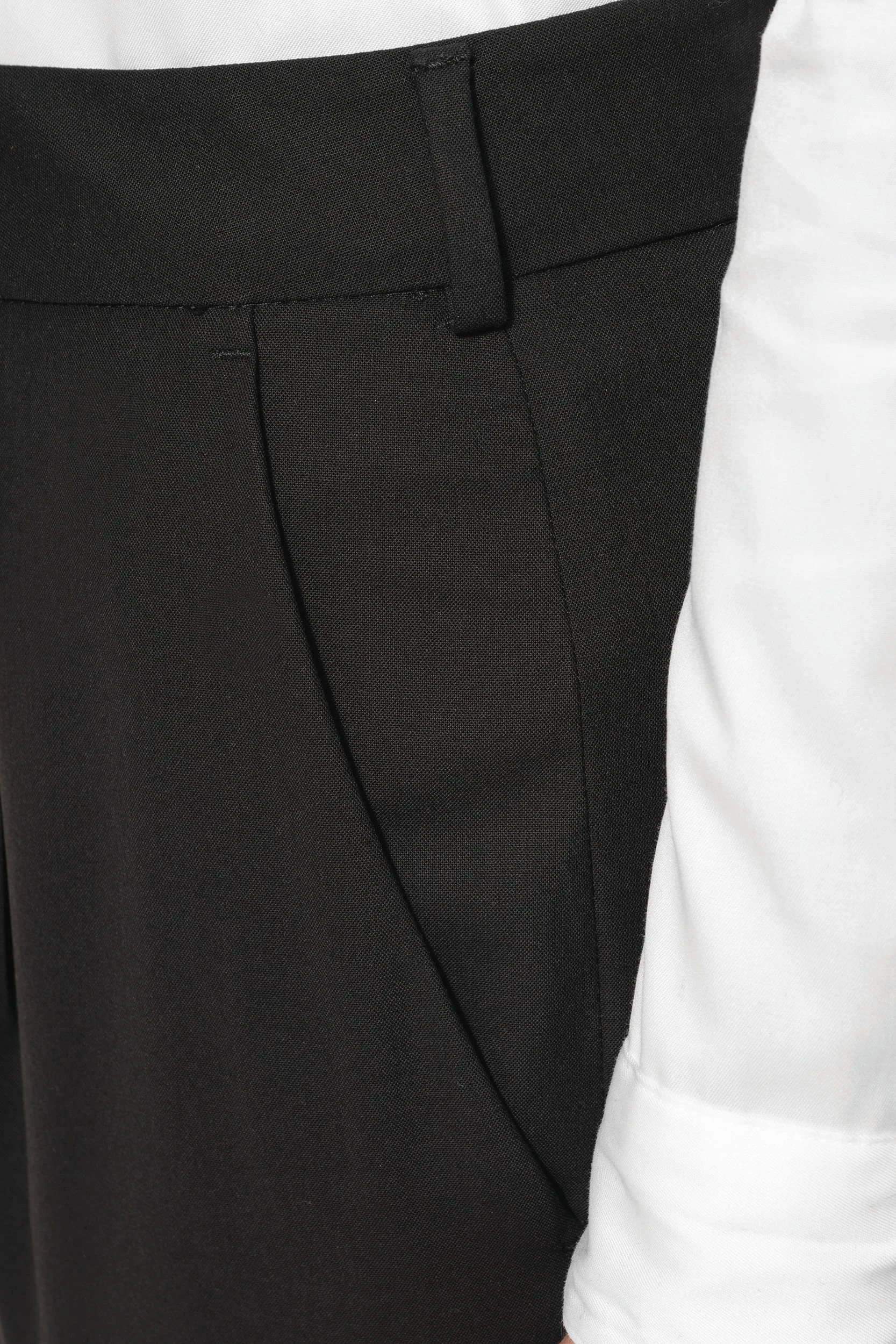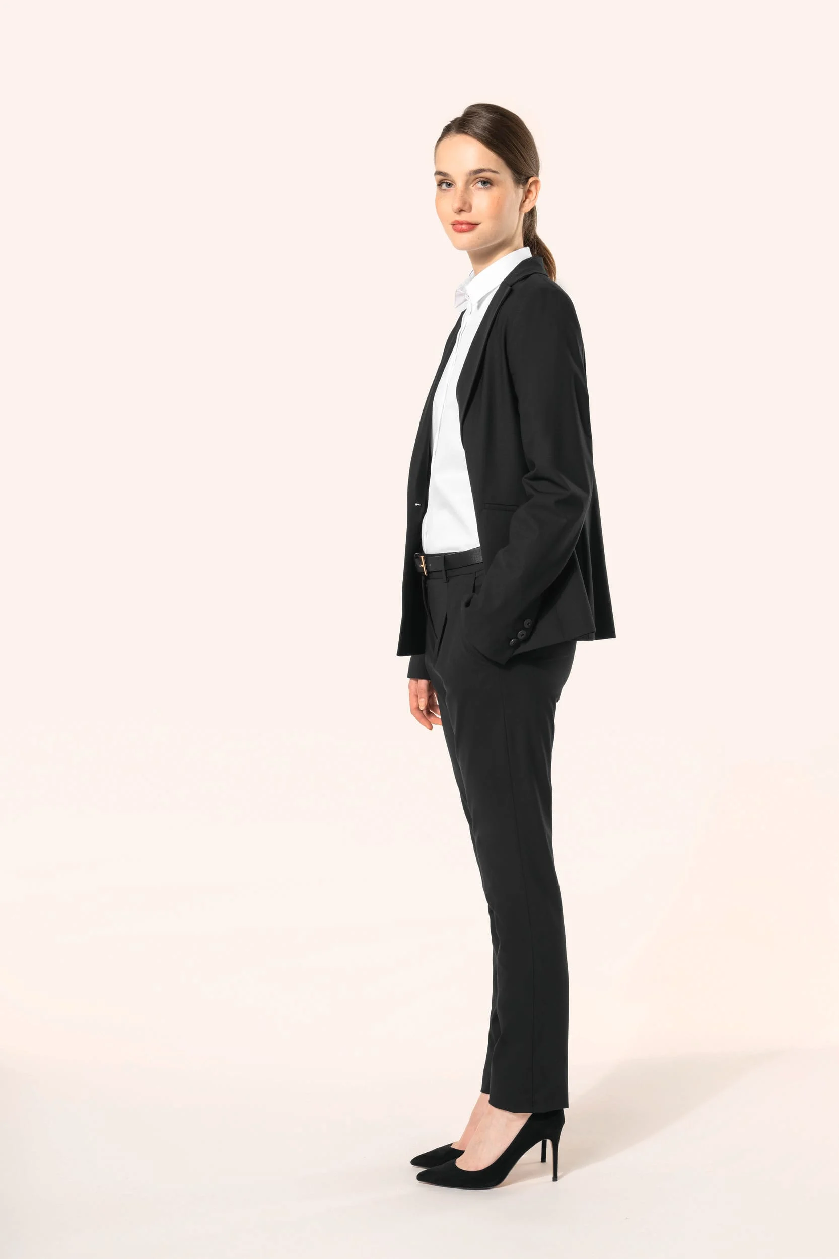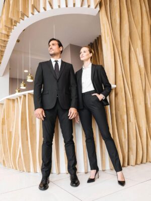 50% polyester / 23% viscose / 22% laine / 5% élasthanne. Doublure ton sur ton 100% polyester. Pantalon coupe ajustée. 2 poches côtés. 2 poches arrière passepoilées. Sac de poche en twill polyester. Fermeture zippée avec agrafe en métal et protégée à l’intérieur par une bande de tissus (sous-pont) maintenu par un bouton permettant plus de confort. Passants pour ceinture à la taille. Biais de propreté à l’intérieur sur la finition de la ceinture. Pli sur le devant de la jambe. Pas d’étiquette de marque, uniquement une puce de taille pour faciliter la personnalisation.