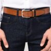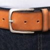 100% cuir. Cuir de vache pleine fleur, finition ainiline. Ceinture plate fabriquée en Italie. 4 tailles disponibles. Boucle métal. Livrée dans sa pochette noire en coton, afin de faciliter la personnalisation.