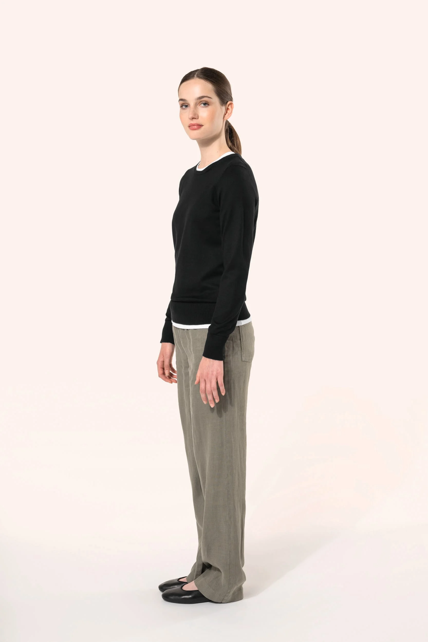 100% coton Supima®. Coton peigné. Jauge 12. Tissu de qualité supérieure. Fully-fashioned : tricoté dans la forme et assemblé sur machine de remaillage. Encolure, poignets et bas du vêtement rib 1 x 1.