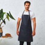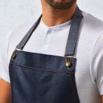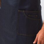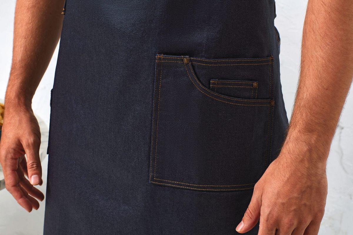 100% coton denim avec une finition acrylique “effet huilé” longue durée qui confère au tablier une apparence de solidité, de durabilité et un certain charme “industriel” reflétant le décor de bon nombre de restaurants. Grande poche plaquée pouvant contenir une tablette avec finition couture poche classique. Poches extra-larges avec finitions surpiqûres et rivet. Cordons contrastés et système d’attache avec œillet en métal. Détails tissu : poche plaquée et porte torchon. Dimensions : H 86 cm x L 72 cm.