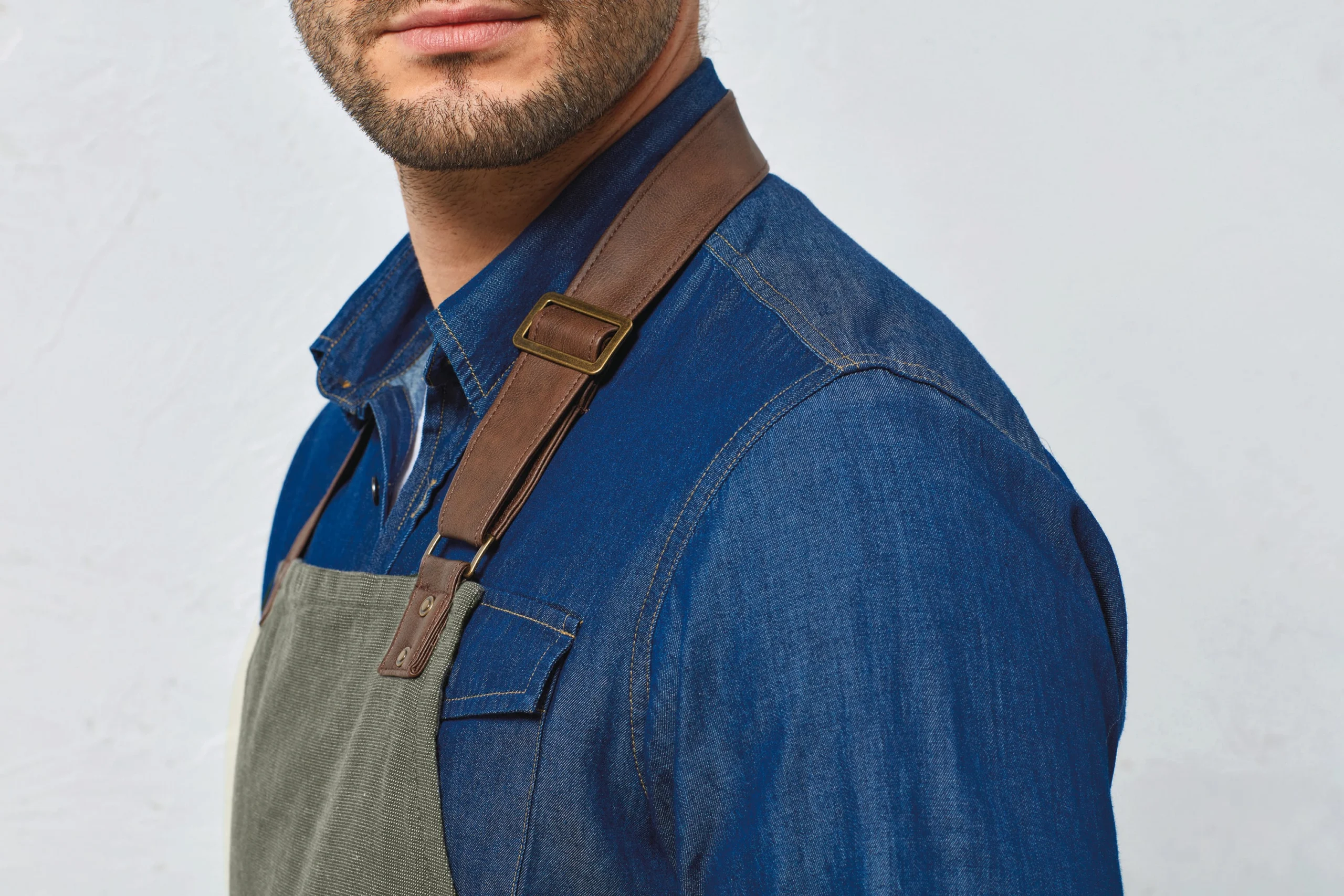 100% coton oxford tissé-teint. Tour de cou en similicuir avec boucle de réglage. Porte chiffon et détail de rivet en similicuir. Poche centrale et poche combinée pour des stylos. Double anneau en D à la taille. Lavage domestique à 60°C.