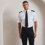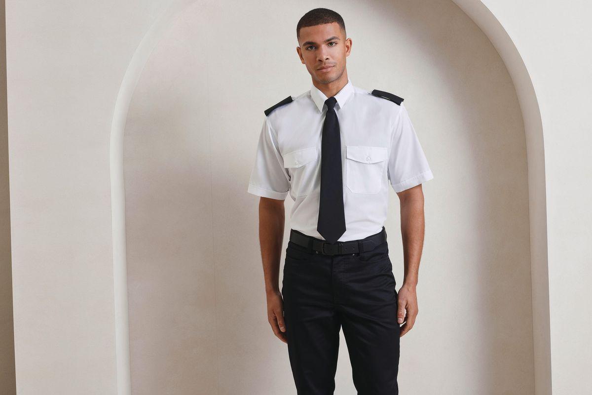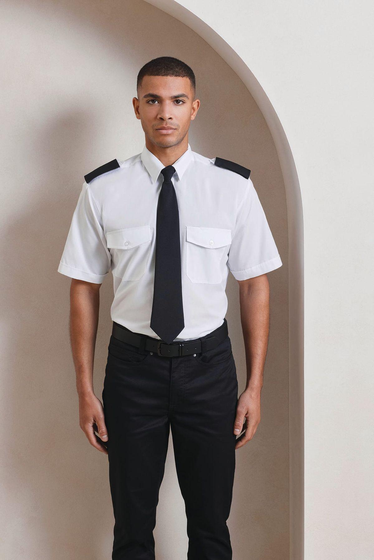 65% polyester / 35% coton, popeline simple. 2 poches avant boutonnées et emplacement stylo sur côté gauche. Galons non fournis. Entretien facile. Tour de col en cm entre parenthèses.