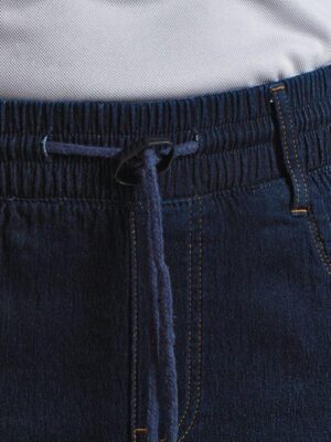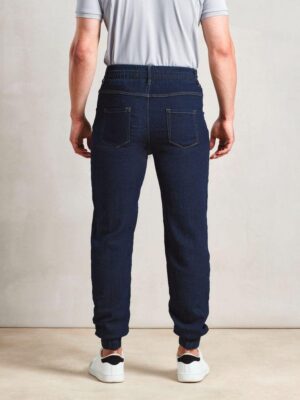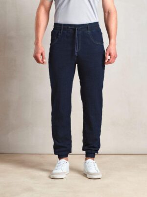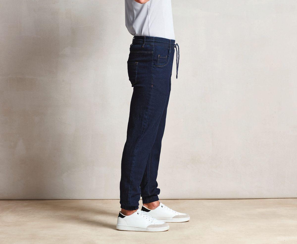 87% coton / 12% polyester / 1% élasthanne sergé. Pantalon imitation jogging doux et confortable. Chevilles et taille élastiquées. Cordon de serrage à la taille. Fausse braguette cousue. Poches sur les côtés et deux poches plaquées au dos. Longueur de jambe : 82 cm.
