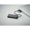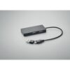 Câble de charge en aluminium recyclé. Sortie : 2 x Type-A et 1 x Type-C. Entrée : 2-en-1 Type-C et Type-A. Longueur du câble : 20 cm.