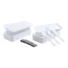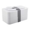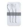 Lunch box antibactérien en plastique avec set de couverts (fourchette, cuillère et couteau) et sangle élastique. Avec 2 compartiments de 700 ml chacun. Conforme à la norme ISO 22196. Matieres : : Plastique (PP) . Passe au lave-vaisselle : Oui Passe au micro-ondes : Oui.