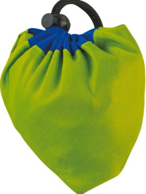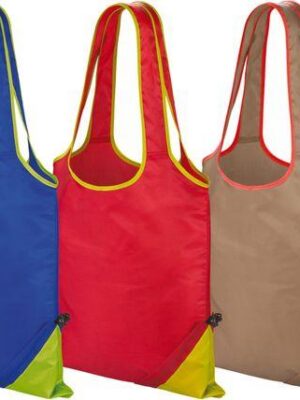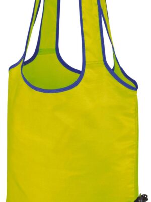 100% polyester. Sac repliable dans la poche située dans un angle, cordon de serrage sur la poche. Coutures solides. Bords contrastés. White : anses unies.