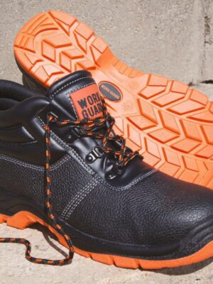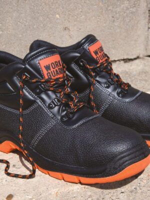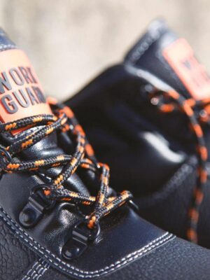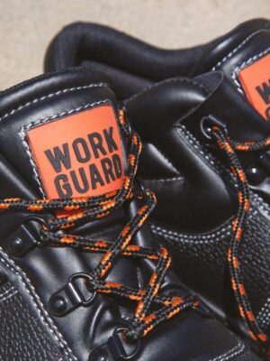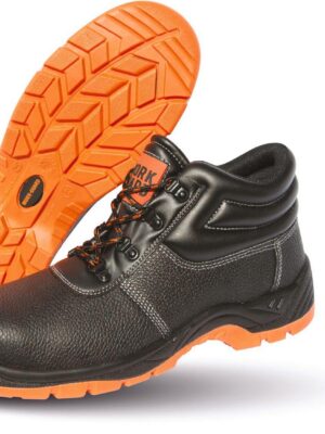 Chaussure montante à tige en croûte de cuir estampée noir résistant à l’eau. Doublée maille filet noire et rembourrée à hauteur de la malléole. Œillets noirs brillants et 3 jeux de lacets fournis (Orange, Black et Orange/Black). Semelle PU double densité résistante à l’huile, embout en acier et semelle intercalaire en acier. Collier et languette rembourrée. Talons absorbeurs de chocs. EN 20345:2011 S1P SRA.