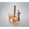 Set de verres à cocktail. Comprend 7 pièces : deux gobelets, un doseur double face en acier inoxydable (25&50 ml), un mélangeur en bois, un agitateur en acier inoxydable et deux moules à glace sphériques en silicone.