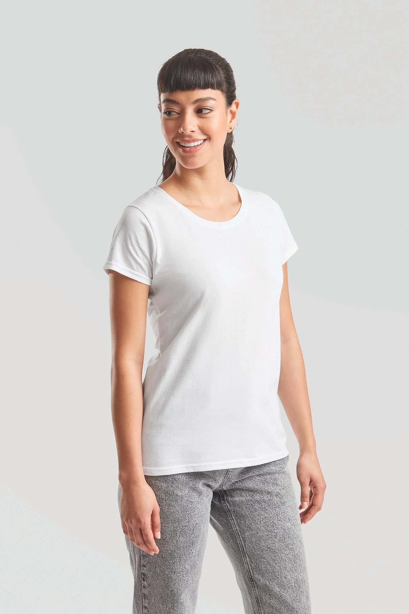 100% coton (sauf coloris Heather Grey : 97% coton / 3% polyester). Col rond avec bande de propreté de même tissus. Coupe féminine cintrée.