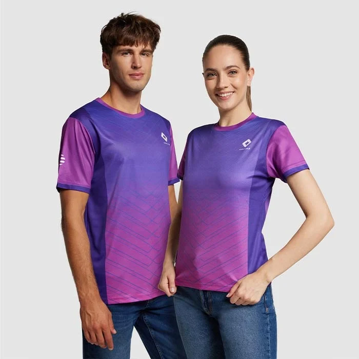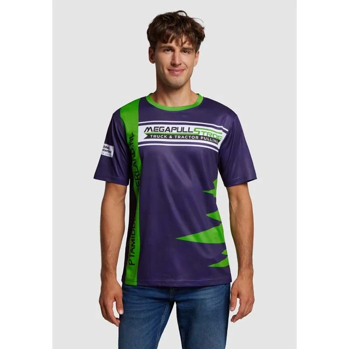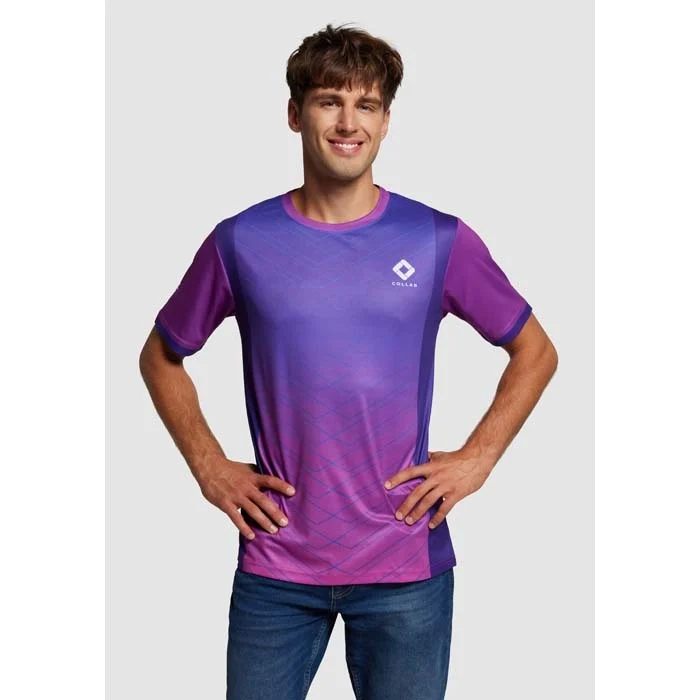 Tshirt promotionnel à col ras du cou en polyester avec impression allover sur le devant, le dos et les manches. Créez vos propres motifs et logos avec un nombre illimité d’options de couleurs.